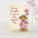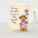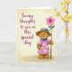 This greeting card features a friendly, plush-like bear standing on the right side, its tawny fur softly shaded as it faces the viewer with a gentle, welcoming look ❤️. It wears a pink dress decorated with small white flowers and a neat blue trim, giving it a sweet, dressed-up feel. A straw hat with a blue ribbon sits slightly tilted, and a small blue bow tie adds a touch of charm, as if it’s ready to greet someone special. In one paw, the bear holds a tall green stem topped with a large pink flower, and the way it presents it feels like a quiet offering between close friends. On the left side of the creamy, lightly textured background, the message “loving thoughts to you on this special day” appears in bright pink, arranged in a flowing cursive style that balances the character on the right. The soft lighting keeps everything gentle and cozy, with warm yellows, rosy pinks, and cool blues working together like a calm spring afternoon 🌼. The flower has five broad petals with a dark center, and two small buds sit alongside it on the same stem.