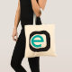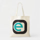 This design is a lower case e. The e is in a turquoise blue with a black edge. This lower case e design looks great on this Tote Bag