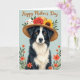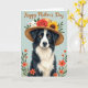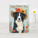 Designed with a detailed black-and-white dog at the center, this card shows the pup looking straight out with warm amber eyes that feel like a loyal, affectionate glance ❤️. A straw hat sits on its head, and the woven texture is easy to see along the brim and crown. Tucked into the hat are a red rose, a golden sunflower, and a tiny fluffy lamb nestled in green leaves, creating a sweet, cozy companionship between the animals. The background is a calm, soft blue, giving the portrait plenty of breathing room. Along the lower edges, orange flowers and slim green stems rise upward like a gentle garden border 🌼. Near the top, a short message appears in shimmering gold lettering, centered above the dog’s head. Fine details like the whiskers, fur strands, and the hat’s braided fibers stand out against the pale blue field and the warm orange floral accents.