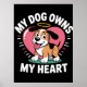 This charming graphic features an adorable, happy cartoon dog, predominantly white with brown and black patches, sitting contentedly with its tongue out. A pink heart shape frames the dog, and a small halo hovers above its head, symbolizing its angelic nature. The bold white text at the top and bottom reads "MY DOG OWNS MY HEART," conveying deep affection. The design is set against a solid black background. Digital download for personal use only.