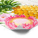 Luau Hawaiian theme wedding banner with tropical foliage, plumeria, hibiscus, pineapple, and white wash wood background.