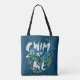 Sea monster Luca swimming with a school of fish, featuring the words "Swim With Me".