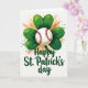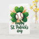 This St. Patrick's Day card features a large four-leaf clover in rich deep green at the center, its glossy leaves shaped like a gentle cradle around a bright white baseball. The baseball’s red stitching stands out crisply, like a careful touch that pairs naturally with the clover’s soft curves, hinting at a sweet connection between two lucky charms. Behind the main image, loose bursts of orange and green spread outward with tiny golden specks, like confetti caught midair for a party that’s just getting started ☘️. The colors feel warm and upbeat, giving the scene an easy, friendly energy that could fit both close friends and couples sharing an inside joke. Near the bottom, the words “Happy St. Patrick’s day” sit centered beneath the clover in dark emerald lettering, tying the message back to the main green theme 💚. The text is placed low enough to leave the clover-and-baseball pairing as the clear focal point while still being easy to spot at a glance. Golden dots and paint-like splashes continue around the clover, with orange accents peeking through the background behind the leaves.