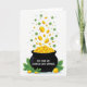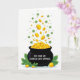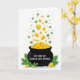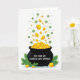 This St. Patrick's Day card shows a black, round cauldron at the bottom, overflowing with shiny gold coins that catch the light against a white background 💚. A spray of coins rises up from the pot like a little fountain, with several four-leaf clovers drifting among them in different shades of green ☘️. Tiny gold stars are scattered between the coins, adding a gentle sparkle that feels like a shared wink between friends. At the base, leafy green sprigs with fine veins curl around the pot, as if they’re leaning in close to frame the scene. The message “MAY YOUR DAY OVERFLOW WITH HAPPINESS” sits centered on the front of the cauldron in gold, all in uppercase. The dark pot makes the gold lettering and coins stand out, while the greens soften the edges and keep the scene warm and inviting. Coins, clovers, and stars arc upward above the pot, spreading out as they rise across the open white space.