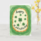 This greeting card features an irregular, cloud-like frame that feels like it’s gently wrapping a note from a close friend 💚. Inside the frame, a creamy yellow center holds the phrase “happy St. patrick’s day” in flowing black lettering, set neatly across the middle. Around the words, small shamrocks and four-leaf clovers are scattered like quiet little winks between two people sharing a laugh ☘️. Each clover is bright green with thin black outlines, and one slightly larger four-leaf clover sits near the center as a calm focal point. The frame is edged with a black outline, then a strong orange band, and then a wide green area beyond it. That outer green space is made of layered watercolor-like rings that shift from deep emerald to soft sage, giving the background a gentle, drifting depth. The orange band sits snugly between the black edge and the green washes, making the border look carefully stacked and easy to follow. Concentric green brushy circles ripple outward behind the frame, fading from darker green near the edge to lighter, airy green toward the corners.
