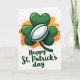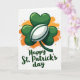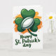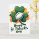 This greeting card features a large three-leaf shamrock in deep emerald green, shaded to look softly rounded against a bright white background. Tucked inside the shamrock sits a classic white rugby ball with slim green bands, like it’s being held close in a friendly, shared moment. Behind the main emblem, a wide orange brushstroke sweeps across the page, adding warmth and a lively contrast. Small orange specks dot the area around it like scattered confetti, giving the scene a casual, celebratory sparkle. Near the bottom, the phrase “Happy St. Patrick’s day” appears in flowing forest-green lettering, centered beneath the shamrock. The gentle highlights on the leaves and the slight shine on the ball add a cozy, together-at-the-game kind of closeness 💚. The orange stroke sits diagonally behind the shamrock, with the specks spread unevenly around the upper and side edges ☘️.