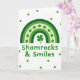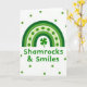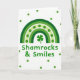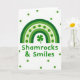 This greeting card shows a green-toned rainbow stretching across a white background, with bands shifting from deep forest green on the outside to a lighter lime shade toward the center 🌈. One pale band is dotted with round green spots, giving the arches a flirty, confetti-like texture that feels like a friendly wink. Tucked right beneath the rainbow’s peak sits a single shamrock, centered as if it’s being offered to someone special ☘️. The phrase “Shamrocks & Smiles” appears below the shamrock in a rounded sans‑serif style, set in green and aligned neatly in the middle. Around the main design, darker green dots are scattered across the white space like little notes drifting between close friends. The open background keeps the focus on the rainbow and shamrock, while the repeated dots make the scene feel lively without getting busy. The shamrock sits directly above the centered line of text, and the surrounding dots vary in placement to create a light, floating pattern.