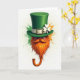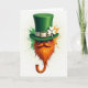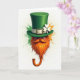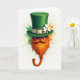 This card features a stylized leprechaun head centered on a white background, topped with an emerald green hat that has a white band, a gold buckle, and a white shamrock ☘️. Dark glasses and a thick mustache hide most of his expression, yet the slight tilt of his head gives him a cool, friendly charm, like he’s sharing a private joke with you 💚. A long, textured orange beard pours downward in wavy strands, then narrows and curves into the hooked handle of an umbrella in the same warm orange tone. Green and orange paint splatters scatter around the figure, adding movement and a party-like energy without crowding the main image. The greeting text sits near the top in green lettering, balanced above the hat so the character remains the focus. Smaller accent text appears near the bottom in orange, echoing the beard-umbrella shape. The hat’s glossy highlights and the beard’s layered strokes stand out sharply against the white space and the scattered green-and-orange specks.