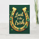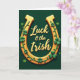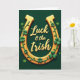 This St. Patrick's Day card features an upward-facing golden horseshoe centered on a deep emerald background, its metallic sheen catching the light in soft highlights. A slender green vine curls along the inner curve, dotted with plump shamrocks in layered shades of green that look gently raised, like you could trace each leaf with a fingertip ☘️. Tucked inside the arch, the words “Luck o the Irish” sit neatly across the middle in luminous gold lettering that stands out against the darker green. The warm gold and rich greens feel like a cozy toast shared between close friends, with the horseshoe cradling the phrase the way an arm might draw someone in. Subtle shadows around the horseshoe edges and clover leaves add depth, giving the whole scene a calm, evening glow 💚. In the background, small clover silhouettes are scattered across the green field, spaced lightly so the center stays the focus. Tiny, simplified clover shapes repeat behind the main image in slightly darker green tones.