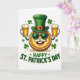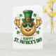 This greeting card features a shiny gold coin character front and center, smiling under cool green sunglasses and a curled white mustache that feels like it’s aimed at a close friend 💚. A tall emerald leprechaun hat sits on top, finished with a dark brown band and a small gold buckle. On either side, two raised mugs of golden beer lean inward as if clinking together, with thick creamy foam spilling up in soft clouds. The background stays plain white, letting the greens, golds, and creamy whites stand out clearly without distractions. Small green shamrocks float around the coin like confetti, adding extra St. Patrick’s Day flair ☘️. Along the lower area, the phrase “HAPPY ST. PATRICK’S DAY” appears in green letters with a slight shadow for depth. The coin’s ridged edge is visible all around, and the sunglasses reflect light with a glossy gleam.