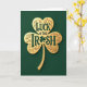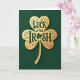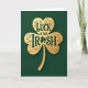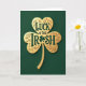 This card features a three-dimensional golden shamrock centered on a deep emerald green background, glowing with warm metallic highlights and a lightly grainy texture. Delicate Celtic-style scrollwork curls across each leaf, giving the emblem an ornate, treasured look. The lighting falls softly from above, creating gentle shine along the edges and a subtle shadow beneath, as if the shamrock is lifting toward the viewer. Across the leaves, the phrase “LUCK OF THE IRISH” is placed in an ornate, classic typeface, rendered in gold to match the shamrock. A small four-leaf clover replaces the “O” in “IRISH,” adding a sweet little wink of fortune ☘️. The rich green backdrop and golden centerpiece feel like a quiet toast shared between close friends, with the warm glow suggesting an affectionate, knowing glance 💚. The final detail is the tiny clover “O,” tucked neatly within the word “IRISH” on the lower leaf.