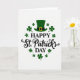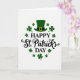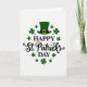This card features a festive St. Patrick’s Day layout centered on the large phrase “Happy St. Patrick’s Day” in green, with “St. Patrick’s” set in a flowing style that feels like it’s gliding between the other words. Above the text sits a classic leprechaun top hat in emerald green, angled slightly as if tipping hello to someone special. A black band wraps the hat, and a golden buckle adds a bright metallic touch that draws the eye. Around the greeting, shamrocks in several green tones float and scatter, giving the scene a light, friendly energy that feels like a shared inside joke between friends 💚. The white background keeps everything easy to read while letting the greens stand out without crowding the page. The main message stays in the center, with the hat anchoring the top and the clovers framing the words like a gentle embrace ☘️. The shamrocks vary in size and spacing, with a few smaller ones tucked near the edges and larger ones circling closer to the lettering.