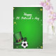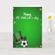 This card features a rich green background that fades from deep emerald to bright lime, setting a festive St. Patrick’s Day scene 💚. Across the top, the words “Happy St. Patrick’s day” appear in white lettering, stretched wide and easy to spot against the green. Down in the lower left, a deep green leprechaun hat with a curved brim leans close to a classic black-and-white soccer ball, like two friends posed side by side for a photo ☘️. The hat’s black band and golden buckle add a warm gleam that draws your eye toward that corner. Small yellow four-petal flowers, tiny golden dots, and white snowflake-like shapes are sprinkled around the design like confetti. A soft glow near the center brightens the middle of the card and gently highlights the text above. The scattered details float across the frame, with the brightest light sitting just beneath the top line of text.