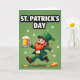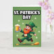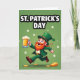 This card shows a cheerful leprechaun striding across the lower middle of the scene in an emerald green suit and tall hat topped with a shamrock ☘️. His bright blue eyes and wide grin peek out from a thick orange-red beard, and the friendly lift of his eyebrows makes the toast feel like it’s meant for someone special. One arm is raised high as he offers a foamy mug of golden ale, like he’s clinking glasses with a close friend 💚. The background is a rich green field dotted with small white four-leaf clovers, giving the setting a lucky, festive look. Gold coins scatter along the ground near his steps, with a few shown mid-tumble as if he just kicked them forward. Across the top, the text “ST. PATRICK’S DAY” sits centered in large white letters that stand out sharply against the green. The mug’s froth curls upward in pale cream strokes, and the coins shine in warm yellow-gold circles near the bottom edge.