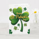 This design shows a large three-leaf shamrock centered on a bright white background, shaded in layered greens to look rounded and glossy, like it’s softly lit from above. Across the middle of the shamrock, the text “Happy St. Patrick’s Day” sits on a slight curve in golden-yellow lettering with a thin brown outline, standing out clearly against the green. The main clover feels like a shared lucky charm between two close friends, as if it’s being offered with a quiet smile and an inside joke. Smaller, flatter shamrocks in different green tones are scattered around the centerpiece, adding movement like a light confetti drift ☘️. The mix of deep forest green and lighter minty highlights gives the central shape extra depth without crowding the page. The open white space keeps everything airy, letting the gold letters read easily while the greens feel fresh and inviting 💚.