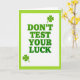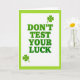 This card features a bright white background with a lime green border that frames the design like a neat picture window. Centered and stacked in the middle, large emerald green letters read “DON’T TEST YOUR LUCK,” arranged vertically so each word lands with a confident beat. The letterforms are thick with gently rounded serifs, giving the message a classic signboard feel without any fuss. Two four-leaf clovers sit on opposite corners—one in the upper right and one in the lower left—tilted on the diagonal like a pair leaning toward each other in a quiet, friendly nod. The greens stay within the same family, with the border slightly lighter than the text so the words stand out clearly 💚. Everything is evenly lit with no shadows, keeping the edges sharp and the layout easy to take in at a glance. The overall look is simple and direct, with the clovers adding a small wink of luck ☘️. The lime frame, emerald headline, and two diagonal clovers are the only elements on the white field.