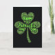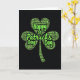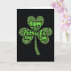 This design shows a four-leaf shamrock centered on the card, its leafy shape built from many tiny words that fit together like a dense mosaic. Against a deep black background, the neon and lime-green lettering glows, giving the scene a late-night city-light feel. The main phrase, “Happy St. Patrick’s Day,” sits prominently within the shamrock in bright lime green, easy to spot at first glance. Smaller words in varying sizes curve and cluster around it to carve the shamrock’s edges, like friends leaning in close to form a shared picture 💚. The tight spacing and layered text create a cozy closeness, with the larger greeting holding the center while the smaller pieces gather around it like a supportive circle ☘️. The overall look stays modern and graphic, with the dark backdrop making every green letter stand out sharply. In the shamrock’s contours, the tiniest words thicken near the outer curves and thin slightly toward the inner veins, shaping each leaf with crisp detail.