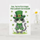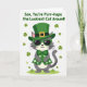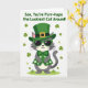The front design shows an anthropomorphic grey cat centered on a bright white background, dressed up for St. Patrick’s Day with a green top hat featuring a gold buckle and a matching green bow tie. The cat wears a green jacket dotted with small white shamrocks, and its lime-green sunglasses sit low enough to let a tiny black nose and a soft, knowing smile show through, like it’s sharing a private joke with you. Pink inner ears and neat black whiskers add to the friendly, slightly flirty look, while a small tuft of green grass beneath its feet grounds the scene. Four-leaf clovers float around the cat in several shades of green ☘️, creating a light, lucky swirl that frames the character without crowding it. Across the upper part of the card, green lettering reads, “Son, You’re Purr-haps the Luckiest Cat Around!”, standing out clearly against the white space. The layout leaves plenty of open area around the cat, giving the message room to breathe and keeping the focus on that confident little grin 💚. The hat’s emerald green, the jacket’s shamrock pattern, and the drifting clovers form a simple green-and-white scene with a small patch of grass at the bottom.