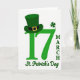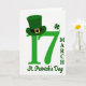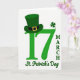 This card shows a large green “17” centered on a bright white background, with the number acting like a cheerful focal point for St. Patrick’s Day. A deep emerald leprechaun top hat rests at a slight angle on the “1,” and its black band and gold buckle add a shiny touch that draws your eye. Nestled to the right, a three-leaf shamrock curves out from the “7,” its heart-shaped leaves leaning in as if sharing a friendly secret 💚. Along the left side, the word “MARCH” runs vertically in green, giving the layout a tidy, balanced edge. Beneath the numbers, “St. Patrick’s Day” appears in a flowing green line of text that feels like it’s gently underlining the date ☘️. The greens range from darker forest tones in the hat to lighter jade in the lettering, creating soft contrast against the white space. The hat’s buckle sits near the top of the “1,” while the shamrock hugs the outer curve of the “7” on the right.