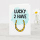 This greeting card centers the phrase “LUCKY 2 HAVE” in large, black sans-serif letters, set against a soft, cloud-like wash of light turquoise that feels airy and close. The words sit high and confident, as if they’re leaning in like a friendly toast between two people who can’t help smiling at each other 💚. Below the text, a golden horseshoe rests in the lower half, outlined in thick black for a crisp, graphic look. Small bright-blue diamond shapes dot the horseshoe like tiny gems, adding a hint of sparkle that reads like a sweet little “you’re special” without needing extra words ☘️. The open end of the horseshoe faces up, suggesting it’s catching good luck the way someone might catch your hand and not let go. A plain white background keeps everything focused on the message and the charm, with lots of breathing room around the artwork. The turquoise wash stays softly behind the lettering while the gold horseshoe sits clearly beneath it, its blue accents evenly spaced along the curve.