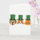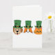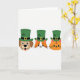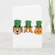 Designed with a wide white background, this St. Patrick’s Day card places a brown dog and two orange cats along the lower edge like they’re leaning in for a friendly group photo. The dog leads the trio with its tongue slightly out, giving the scene an easy, affectionate energy, while one cat peeks from behind as if nudging closer to stay near the others. The second cat faces forward with a gentle, welcoming look, and their soft shading makes their fur feel smooth and polished. Each animal wears a bright green leprechaun top hat with a black band, a gold buckle, and a small shamrock detail, adding a festive touch ☘️. Their wide, dark eyes and small smiles suggest close companionship, like friends sharing a quiet laugh together. Any greeting text sits up in the open white space above them in green, centered and easy to read, with plenty of breathing room 💚. The hats show a slight green gradient, and the golden buckles catch the light against the simple white setting.