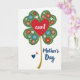 This greeting card features a large four-leaf clover centered on a bright white background, with each green leaf shaped like a soft heart and filled with small flowers in red, white, blue, and pink that feel like a gentle bouquet shared between loved ones ❤️. Tiny yellow dots and little starburst accents are scattered through the floral pattern, adding a light, affectionate sparkle without crowding the design. In the middle of the clover sits a strong red heart with the word “aunt” written across it in smooth white lettering. A thin golden stem drops down from the clover, giving the illustration a subtle gleam, like a cherished keepsake. Beneath the clover, the words “Mother’s Day” appear in large flowing blue lettering, centered and easy to read. Near that phrase, two small hearts—one deep blue and one smaller red—float close together like a quiet sign of closeness 🌼. The clover’s floral details include tiny petals and dots that repeat across all four leaves, creating a balanced, garden-like pattern. The background stays plain white so the green clover, red heart, and blue “Mother’s Day” text stand out clearly, with the gold stem shining softly below.