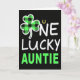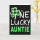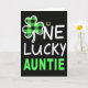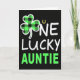 This card features a deep black background with the phrase “ONE LUCKY AUNTIE” taking center stage in high-contrast lettering. The “O” in “ONE” is replaced by a large shamrock, outlined in white, with three leaves filled in a lime-green-and-black buffalo plaid pattern that feels cozy and close-knit 💚. A small golden horseshoe sits just above the “NE,” like a tiny lucky charm hovering over the main message ☘️. “ONE” and “LUCKY” appear in white, set in a friendly, casual handwritten-style font that reads like a note from someone who knows you well. “AUNTIE” is placed beneath them in bright neon green, using a simple sans-serif type that stands firm and confident. The sharp contrast of green and white against black makes the design pop, like a celebratory toast shared between family and friends. The layout is centered and balanced, with the shamrock on the left of “ONE” and the horseshoe perched above the first line as a small, shining accent.