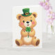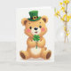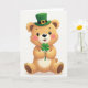 This card features a caramel-brown teddy bear sitting upright on a bright white background, facing you as if waiting for a hug. Its glossy black eyes and rosy cheeks create a shy, affectionate look, like it’s quietly sharing a sweet moment with a close friend. A small open mouth with a peek of pink tongue adds to the gentle, soft-smile expression. Perched on its head is an emerald-green top hat with a dark band and a gold buckle, giving a clear St. Patrick’s Day touch 💚. In its rounded paws, the bear holds a rich green four-leaf clover ☘️, tucked close like a lucky gift meant for someone special. Soft, diffused lighting adds faint shadows under the bear and along its plush curves, making the fur look cozy and touchable. Text sits near the top in green, with a smaller line near the bottom in matching green, while the bear’s hat and clover stand out sharply against the white space.