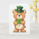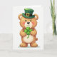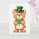 This card shows a round-bellied teddy bear centered on a bright white background, looking straight ahead with a gentle, affectionate smile that feels like it’s meant for a close friend. It wears an emerald-green leprechaun top hat with a dark band and a small golden buckle, adding a festive St. Patrick’s Day touch 💚. The bear’s fur is a warm caramel brown with creamy highlights on its muzzle and belly, giving it a soft, plush look under mild, even lighting. A rosy blush on its cheeks and the slight curve of its mouth suggest a sweet, bashful warmth, like it’s sharing a quiet moment with someone special. Between its paws, it holds a glossy four-leaf clover, carefully centered as if it’s offering a little bit of luck ☘️. The greeting text sits above the bear in green lettering, with a smaller line of text below in a lighter green that balances the layout without crowding the illustration. The hat’s buckle catches a tiny highlight, and the clover’s leaves show subtle shine against the simple white space.