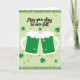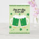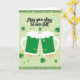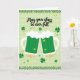 This card shows two beer mugs raised toward each other in a friendly clink, their handles angled like they’re leaning in for a toast 💚. The mugs are filled with bright emerald-green beer, capped with thick white foam that puffs up like soft clouds. Behind them sits a pale lime-green background with a faint diamond lattice that keeps the scene light and festive. Above the mugs, the phrase “May your glass be ever full” appears in flowing dark green lettering, centered near the top. Shamrocks in deeper and lighter greens scatter around the mugs, adding little meeting points for the eye ☘️. Inside the beer, small golden four-leaf clovers drift like lucky charms, while orange-and-gold dash marks burst from the clink point like tiny sparks. Decorative Celtic-style bands in layered greens with touches of yellow frame the top and bottom edges, with a few star-like sparkles sprinkled nearby.