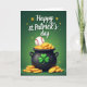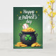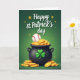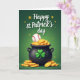 This card shows a matte-black pot brimming with gold coins, set against a smooth emerald-to-deeper-green gradient that gives the scene a soft glow 💚. A rich green shamrock sits on the front of the pot, tying the treasure to St. Patrick’s Day while the warm shine of the coins feels like a shared secret between close friends. Nestled among the gold is a bright white baseball, and its red stitching adds a surprising pop that reads like an inside joke passed back and forth. A few extra coins spill and scatter at the base, as if someone just tipped the pot to show off the stash. Near the top, the words “Happy St. Patrick’s Day” appear in white lettering, centered and easy to spot, with small yellow starbursts on each side ☘️. Tiny golden bokeh dots float around the background like distant sparkles, adding depth without crowding the main objects. The pot’s deep dark finish contrasts sharply with the coin highlights, and the baseball sits slightly to one side among the gold, its curved seams clearly visible.