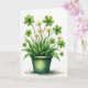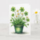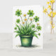 The front design shows a watercolor potted bouquet rising from a white background, centered like a small gift someone set down for a friend. A deep green ceramic pot holds layers of leafy stems, four-leaf clovers, and a few daisies that lean toward one another as if sharing a quiet moment 💚. Greens range from dark at the pot to softer washes in the leaves and clover, giving the arrangement a gentle, airy lift. The daisies add crisp white petals with warm yellow centers, tucked among the clovers like little notes of affection ☘️. Near the bottom, tiny dark specks cluster at the base of the pot to suggest soil, grounding the airy paint strokes. Any greeting text would sit above the plant in small green letters, leaving plenty of open white space around it. The stems stretch upward in a tall, vertical layout, with the brightest highlights catching along the top leaves and petals for a light, fresh look. Share St. Patrick's Day sentiments with someone you care about, and the final touch is the soft scatter of dark flecks right where the pot meets the white page.