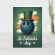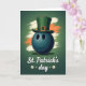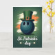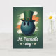 This design shows a deep teal bowling ball centered on a muted forest-green background, with soft highlights and shadows giving it a rounded, glossy look. Two finger holes read as dark, watchful eyes, giving the “face” a coy, friendly expression that feels like it’s sharing a private joke with you 💚. Perched on top is an emerald leprechaun hat, and the bright orange rectangular buckle catches the light like a small spark of attention. Behind the ball, wide horizontal strokes of creamy off-white and warm orange suggest the Irish flag, adding texture and a cozy, together-at-the-lanes kind of warmth ☘️. The greens and oranges sit comfortably together, like close friends leaning in for a photo against a festive backdrop. Along the lower portion, “St. Patrick’s Day” appears in flowing white lettering, flanked by small cream shamrocks on either side. The hat’s brim overlaps the ball slightly, while the off-white and orange bands stretch across the background behind it. End with a friendly line about sharing St. Patrick's Day sentiments.
