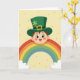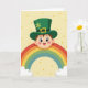 This card shows a wide-eyed boy peeking from behind a big arcing rainbow, his rosy cheeks and open smile giving him a sweet, friendly look. He wears an emerald green leprechaun hat with a gold buckle and a little three-leaf shamrock, as if he’s dressed up to impress someone special 💚. The rainbow bands run in red, orange, yellow, green, and teal, and they rest on soft, puffy clouds that make the scene feel gentle and cozy. Behind everything is a pale yellow background sprinkled with small golden-yellow dots that resemble floating coins or warm sparkles ☘️. The boy’s gaze feels inviting, like he’s sharing a secret bit of luck with a close friend. The greeting text sits near the top in green, with smaller gold lettering tucked beneath it for a neat, balanced look. The rainbow’s curve frames the boy’s face while the scattered golden dots drift across the yellow backdrop.