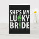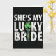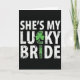This greeting card features the phrase “SHE’S MY LUCKY BRIDE” centered on a deep black background, set in large uppercase sans-serif letters that feel confident and close, like a proud toast between partners. Most of the lettering is white with a worn, speckled texture, giving the words an aged print look that softens the strong contrast. In “LUCKY,” a bright green four-leaf shamrock replaces the “U,” drawing the eye like a little wink of affection ☘️. The same green shows up again in the “C” of “LUCKY” and the “I” of “BRIDE,” and those green letters share the same distressed texture as the white ones. The layout keeps everything tight and centered, so the message reads in one steady beat from top to bottom, with “SHE’S MY” above and “LUCKY BRIDE” below. The limited palette of black, white, and green 💚 makes the couple-focused message feel direct, with the shamrock acting like a small lucky charm tucked into the line. A smooth, glowing green clover sits where the “U” would be, surrounded by textured white letters against the black field.