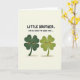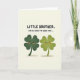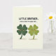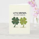 This greeting card shows two smiling four-leaf clovers standing close together on a pale cream background, their faces turned slightly toward each other like close friends sharing a private joke 💚. One clover is a deep forest green while the other is a lighter lime green, and both have tiny black eyes, rosy orange cheeks, and wide curved smiles that make their bond feel warm and easy. Subtle gradients in the leaves add gentle dimension, while soft warm-brown shadows beneath their feet anchor them to the page. Centered near the top, bold hand-drawn lettering in dark ink reads, “LITTLE BROTHER. I’M SO LUCKY TO HAVE YOU...,” tying the pair’s closeness to the lucky clover theme ☘️. The text sits above the characters with plenty of open space around it, keeping the focus on the two figures below. Their slight lean toward one another and matching expressions suggest a caring connection without needing anything else in the scene. The overall layout stays simple: text at the top, the two clovers centered beneath, and a smooth cream field surrounding them. Warm brown shadows pool softly under each clover, just below their rounded stems.