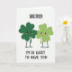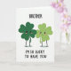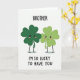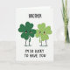The front design shows two cartoon four-leaf clovers standing close together on a white background, their leaves shaded in two greens that set them apart like siblings or close friends. The clover on the left is a deeper emerald, while the one on the right is a lighter lime, and they lean toward each other with soft smiles and rosy cheeks that suggest quiet affection 💚. Each has big, shiny eyes and thin black arms and legs, with their little hands turned inward as if they’re about to hold on. A faint gray shadow beneath them keeps the pair grounded, like they’re standing under a gentle overhead light. Centered above their heads, the word “BROTHER” appears in large black all-caps lettering. Centered below their feet, “I’M SO LUCKY TO HAVE YOU” is also in black all-caps, spaced neatly to balance the page, with a small ☘️ feeling carried by the green characters. The two clovers are positioned side by side in the middle, framed by plenty of open white space and crisp black text.
