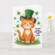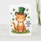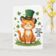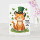 Designed with a cheerful St. Patrick’s Day scene in mind, this illustration centers on a plump orange tabby with darker stripes, sitting calmly on a small patch of green grass while wearing an emerald leprechaun hat with a gold buckle 💚. The cat’s eyes are gently closed, its cheeks are rosy, and its pink nose and relaxed smile make it feel like it’s sharing a private, friendly moment with whoever’s looking. A few shamrocks and tiny yellow flowers float around the cat, like little confetti drifting through the air ☘️. The background stays bright white, which makes the orange fur and deep green hat stand out clearly. On the right side, black text is set in all caps and reads, “FEELING LUCKY AND FEIINE FINE TODAY,” with the funny “FEIINE” spelling leaning into the cat theme. Soft shading and light gradients give the cat’s round shape a cozy, cuddle-ready look, as if it’s settled in close for a quiet celebration. The tail curls to one side, and the scattered shamrocks and flowers frame the cat against the open white space.