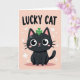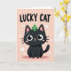 This card features a stylized black cat centered low on the front, gazing up with oversized, glossy eyes that feel like they’re locking onto a friend’s face with gentle attention 💚. A pastel pink background sets a soft, romantic mood, with small white stars and pale clover shapes drifting around like quiet confetti. Above the cat, the words “LUCKY CAT” sit near the top in bold, sans-serif lettering, standing out clearly against the pink. A bright green four-leaf clover rests on the cat’s head, adding a cheerful St. Patrick’s Day touch ☘️. Tiny white speckles scatter across the cat’s dark fur like a light dusting of starlight, giving the silhouette extra depth. The cat’s inner ears are pink and its cheeks are rosy, as if it’s blushing at a sweet compliment. Around the cat, the floating white stars and clover silhouettes are spaced evenly across the pink field, framing the scene.