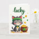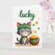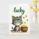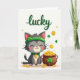 This card shows a sweet grey cat sitting near the lower center on a white background, eyes closed with a small smile and a soft pink blush on its cheeks 💚. The cat wears an emerald green headband topped with a four-leaf clover and a matching collar with a gold coin charm that hangs like a tiny gift from a close friend. To the cat’s right, a rustic brown pot is packed with gold coins, some stamped with dollar signs, and a few tumble out onto the ground as if just shared. A green shamrock decorates the pot, echoing the clover on the cat and tying the scene together with a cozy, affectionate feel ☘️. Near the top, the word “lucky” appears in green lettering, centered like a header above the characters. Around the cat and pot, extra gold coins and green shamrocks drift in the open space, giving the layout light movement and a soft sense of togetherness. The cat’s headband clover and the pot’s shamrock are the brightest green details against the white field, while the coins glint in warm yellow-gold. Wishing you joy as you share St. Patrick's Day sentiments.