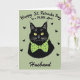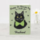 This greeting card features a distinguished black cat with almond-shaped yellow eyes that seem to linger fondly on the viewer, set against a muted sage green background. Its fur has a soft, lightly textured look, giving the cat a calm, confident presence. A lime green bow tie with small gray polka dots sits neatly at the neck, adding a festive St. Patrick’s Day touch ☘️. Small black hearts float around the cat like quiet little hints of affection, turning the scene into a gentle nod to romance and close friendship 💚. Across the upper area, the message “Happy St. Patricks Day” appears in dark lettering that stands out clearly on the green. Below that, “to a PURR-effect Husband” is placed as a second line, with “PURR-effect” drawing attention through its slightly larger, more eye-catching treatment. The layout keeps the cat centered and proud, with the hearts spaced around it and the green bow tie providing the brightest accent in the scene. The final detail is the smooth sage green backdrop framing the cat, dotted with tiny black hearts and topped with the dark text near the top edge.