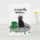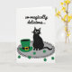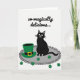This card shows a white background with a jet-black cat on the right, its wide white eyes and big friendly grin turned slightly toward the objects beside it, as if sharing a private joke 💚. To the left sits a classic leprechaun top hat in deep emerald green, wrapped with a black band and finished with a golden buckle that catches the eye. Both the cat and hat rest on a soft gray oval mat, edged with short black fringe lines that spread outward like a cozy little stage. Around the mat, small three-leaf shamrocks in a few green tones are scattered, adding gentle movement and a hint of companionship between the main figures. Above the scene, the words “so magically delicious...” appear in black lettering, centered near the top and spaced so they seem to float over the cat and hat. The cat’s forward-leaning posture and the hat’s close placement create a friendly, almost romantic closeness, like two characters posing together for a lucky St. Patrick’s Day moment ☘️. The gray oval mat sits low in the layout, with shamrocks sprinkled around it and the black fringe marks radiating outward.