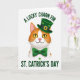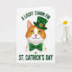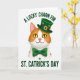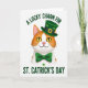 This card shows an orange-and-white tabby cat shown from the chest up on a bright white background, dressed up for St. Patrick’s Day with a tilted emerald-green leprechaun hat and a matching green bow tie 💚. The cat’s golden eyes look wide and inviting, and its small smile feels like it’s meant for a close friend who gets your jokes. The hat is dotted with tiny shamrocks and finished with a gold buckle, adding a little shine above its pink nose and fine whiskers. At the top, green all-caps text curves in an arc reading “A LUCKY CHARM FOR,” hovering like a festive banner over the cat’s ears. Below the cat, the pun “ST. CATRICK’S DAY” appears in green, set on a straight line that balances the layout. A small shamrock sits near the lower wording as a neat accent, tying the look together with ☘️. The scene stays simple and bright, with warm orange fur and rich greens standing out sharply against the white space, and the curved top line, centered cat, and bottom text forming a tidy stacked design.