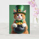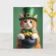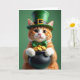 This design shows a ginger-and-white cat centered on a soft emerald-green background, dressed up for St. Patrick’s Day with a green top hat and a shiny gold buckle. A matching green bow tie sits neatly at its neck, and its dark golden eyes look forward with a tender, inviting gaze that feels like it’s sharing a quiet moment with you 💚. The cat’s fur is detailed with warm orange stripes and crisp white patches, and the gentle lighting picks up fine whiskers and a light sheen along the hat’s brim. In its fluffy white paws, it holds a smooth matte black pot, close to its chest like a treasured gift between friends ☘️. Gold coins spill out in a bright cascade, catching the light in small glints that stand out against the darker pot. The greeting “Happy St. Patrick’s Day” appears near the top in bright gold lettering, with a smaller line of text in white placed near the bottom edge. The frame stays tight on the cat, with the green backdrop fading softly toward the corners behind the hat and coin-filled pot.
