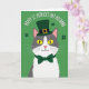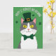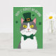 This greeting card features an anthropomorphic cat dressed up for St. Patrick’s Day, with a soft gray coat, a bright white muzzle, and tall ears that frame its face. A dark green leprechaun hat sits at a jaunty angle on its head, finished with a small golden buckle, and an emerald bow tie rests neatly under its chin like it got ready just for someone special 💚. The cat’s wide yellow eyes, with slim black pupils, hold an attentive, affectionate look that feels like it’s locking eyes with its favorite person. The background is a rich green field sprinkled with darker green shamrocks, adding texture without pulling attention away from the cat ☘️. Across the top, the message “HAPPY ST. PATRICK’S DAY HUSBAND” is set in white lettering that arches over the character. The bright text stands out sharply against the green, keeping the greeting easy to spot at first glance. Darker shamrock shapes repeat around the edges, creating a patterned frame behind the centered cat.