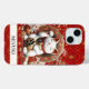 Make a statement with this iphone 15 phone case that features a Lucky Cat with gold coins and flowers around it on a red and gold background. It's modern yet traditional Japanese Maneki-neko is designed to attract good fortune, prosperity and customers into your business. The right paw raised brings money and wealth and the white cat symbolizes general happiness. It becomes uniquely yours with your name in a CAP font in black. Invite luck and prosperity into your life!