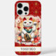 Make a statement with this iphone 16 pro max phone case that features a Lucky Cat with red flowers around it on top of a gold and red background. It's modern yet traditional Japanese Maneki-neko is designed to attract good fortune, prosperity and customers into your business. The left paw raised brings customers and wealth and the white cat symbolizes general happiness. It becomes uniquely yours with your name in a CAP font in black. Invite luck and prosperity into your life!