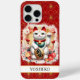 Make a statement with this iphone 15 pro max phone case that features a Lucky Cat with red flowers around it on top of a gold and red background. It's modern yet traditional Japanese Maneki-neko is designed to attract good fortune, prosperity and customers into your business. The left paw raised brings customers and wealth and the white cat symbolizes general happiness. It becomes uniquely yours with your name in a CAP font in black. Invite luck and prosperity into your life!