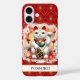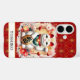 Make a statement with this iphone 16 phone case that features a Lucky Cat with red flowers around it on top of a gold and red background. It's modern yet traditional Japanese Maneki-neko is designed to attract good fortune, prosperity and customers into your business. The left paw raised brings customers and wealth and the white cat symbolizes general happiness. It becomes uniquely yours with your name in a CAP font in black. Invite luck and prosperity into your life!