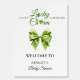 Lucky charm sage green bow with green clover St. Patrick's Day Irish baby girls shower Welcome sign foam board . An elegant sage green coquette bow, decorated with bright green clovers, adds a touch of Irish whimsy to this "WELCOME" sign. It also includes the text "A little Lucky Charm is on the way," using shamrocks to replace two letters and set a joyful mood.